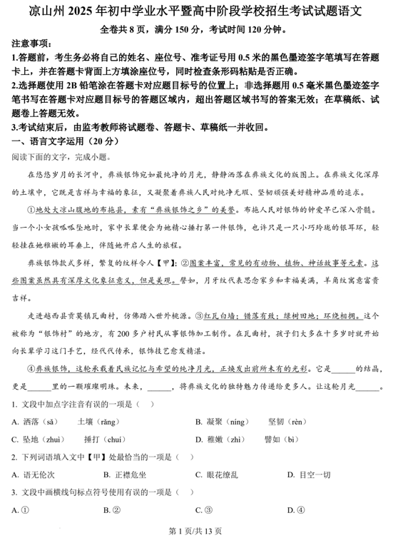 2025年四川省凉山彝族自治州中考语文真题