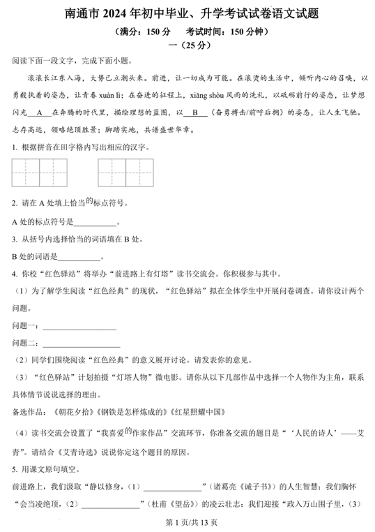 2024年江苏省南通市中考语文真题