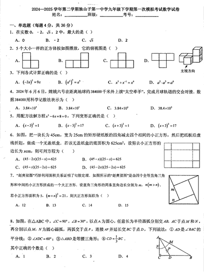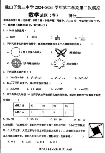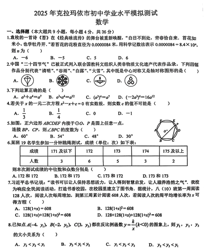 2025年新疆维吾尔自治区克拉玛依市初中学业水平模拟测试(数学问卷)