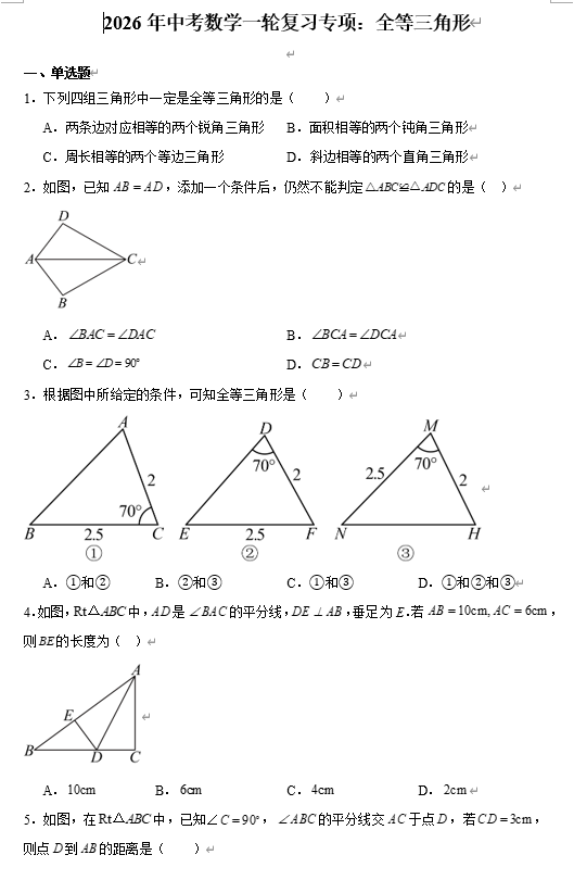 2026年中考数学一轮复习专项:全等三角形