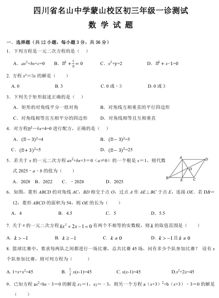 四川省雅安市名山中学蒙山校区2025-2026学年九年级上学期一诊测试数学试题