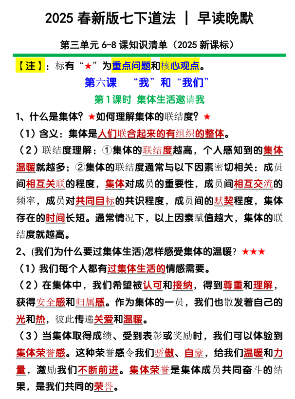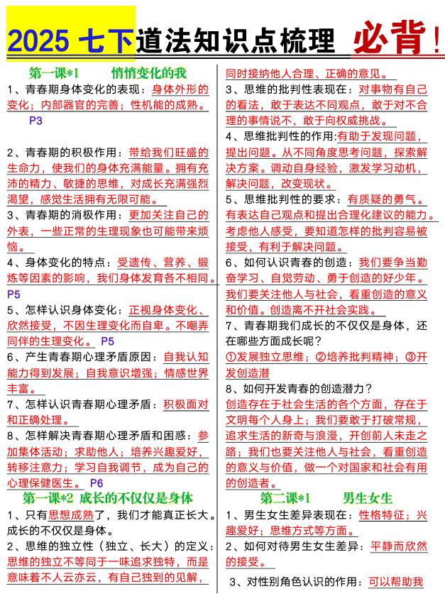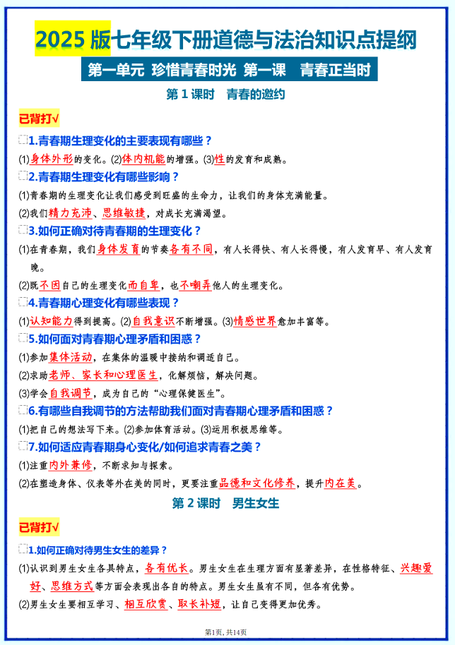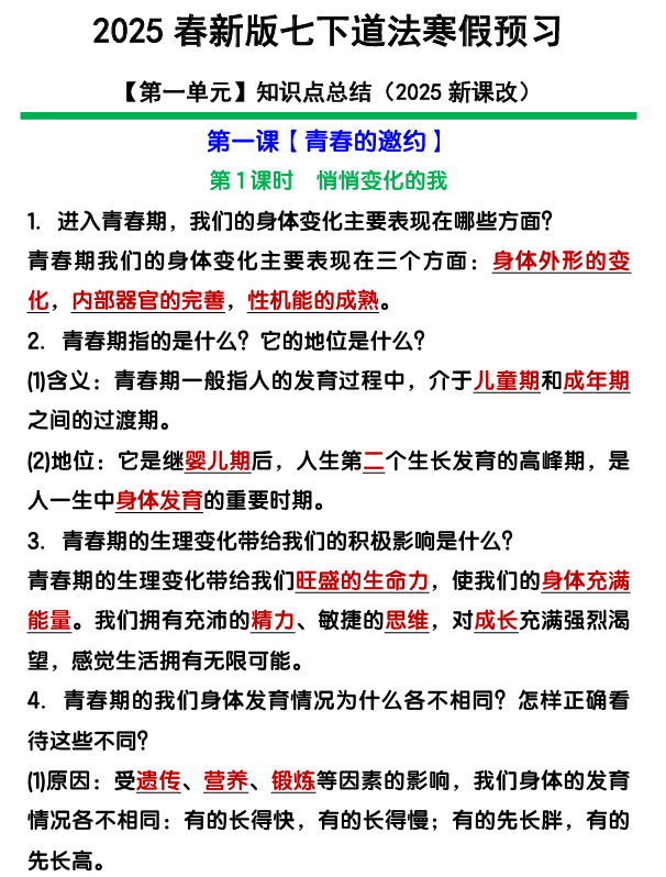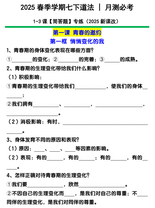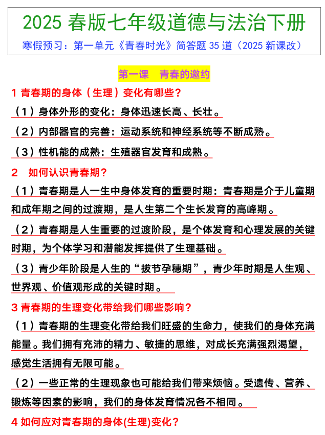 七年级下册道德与法治第一单元《青春时光》简答题35道
