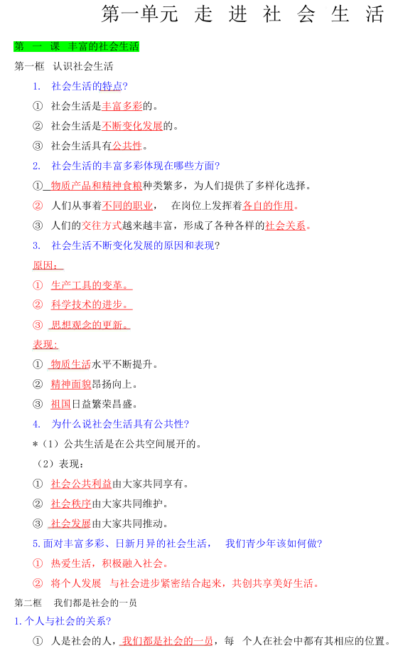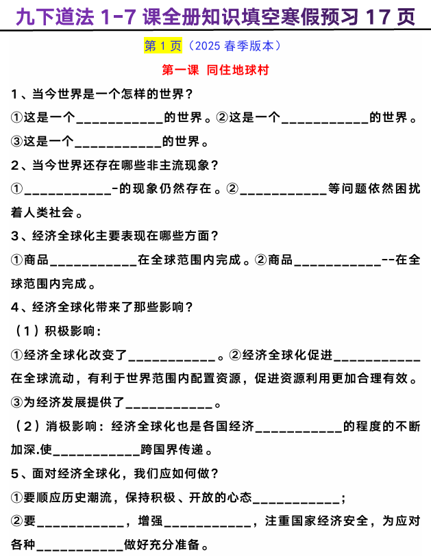 九年级下册道法1-7课全册知识填空寒假预习17页