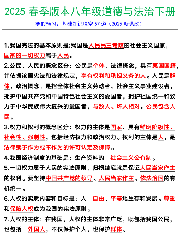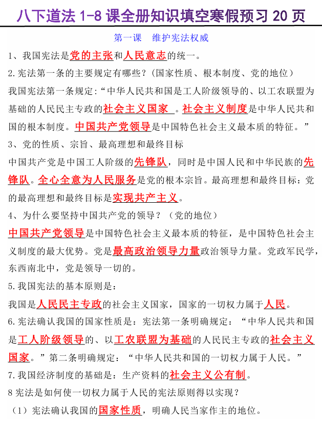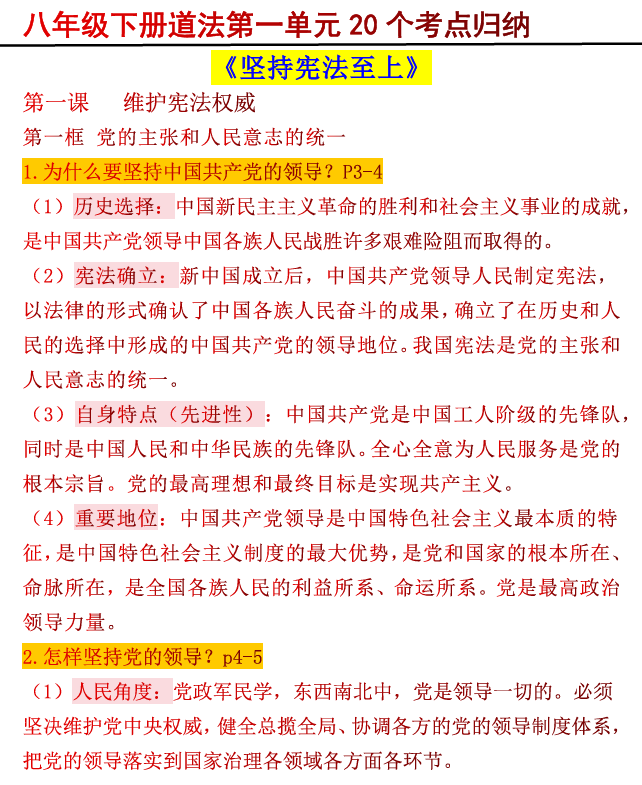 八年级下册道法第一单元《坚持宪法至上》20个考点归纳