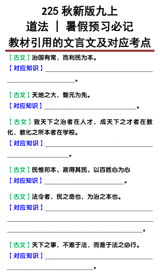 【2025秋新版】九上道法:教材引用的文言文及对应考点