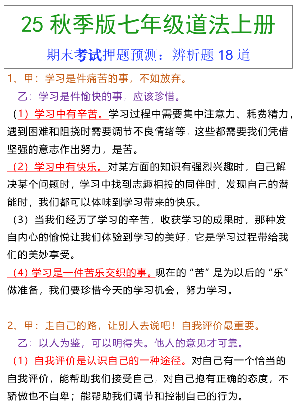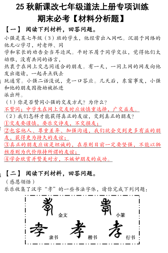 2024(新人教版)七年级道法上册专项训练:期末必考【材料分析题】含答案