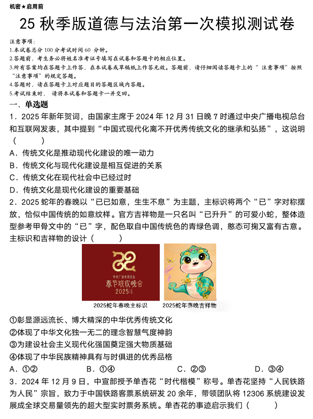 【2025秋新版】中考道德与法治第一次模拟测试卷