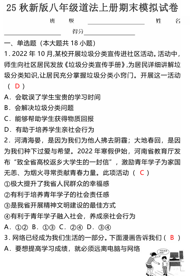 【2025秋新版】八年级道法上册期末模拟试卷