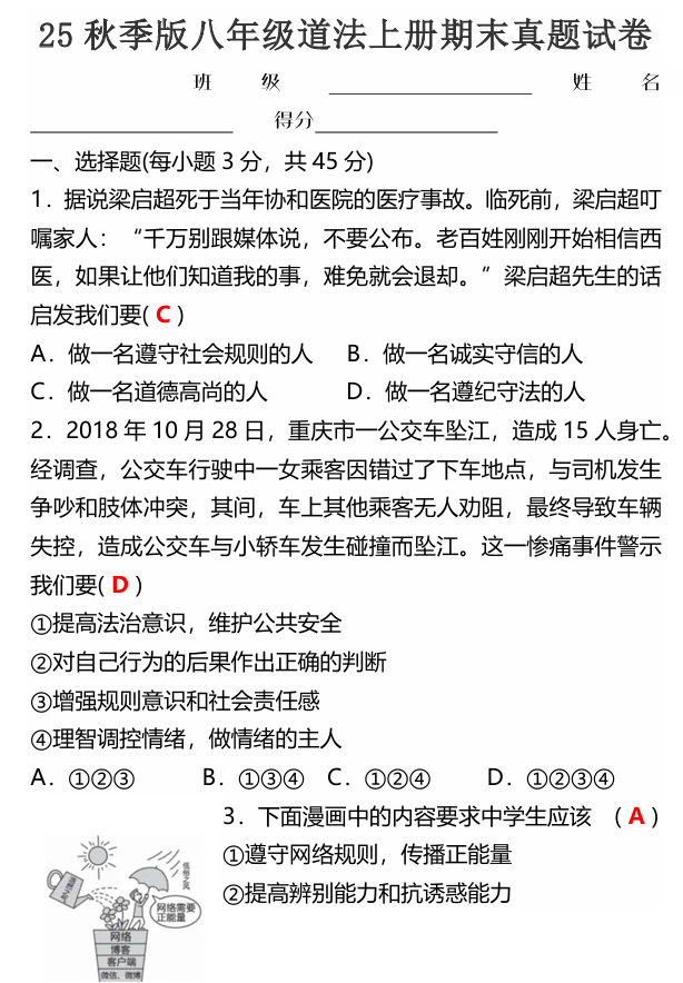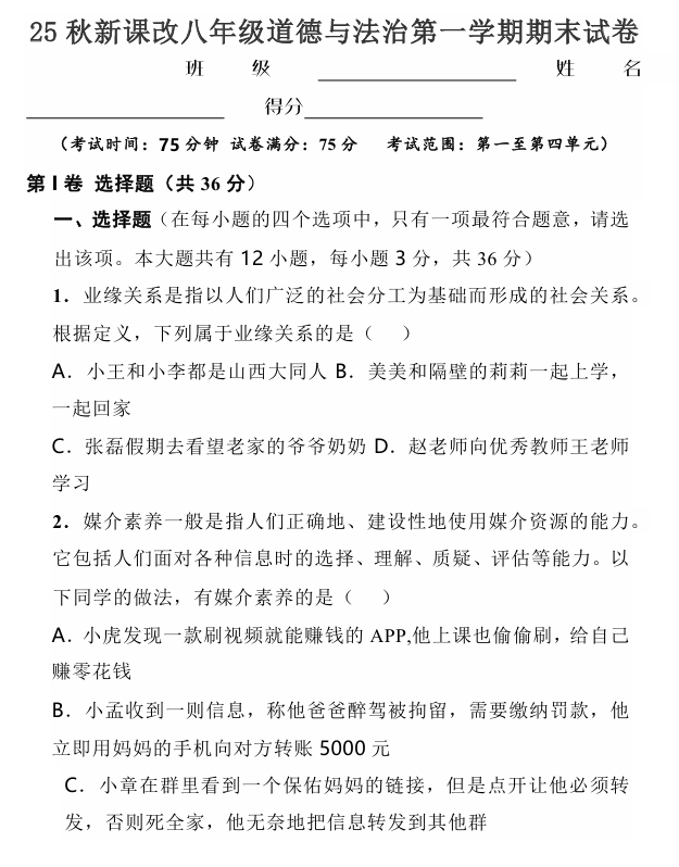 【2025秋新版】八年级道德与法治第一学期期末试卷