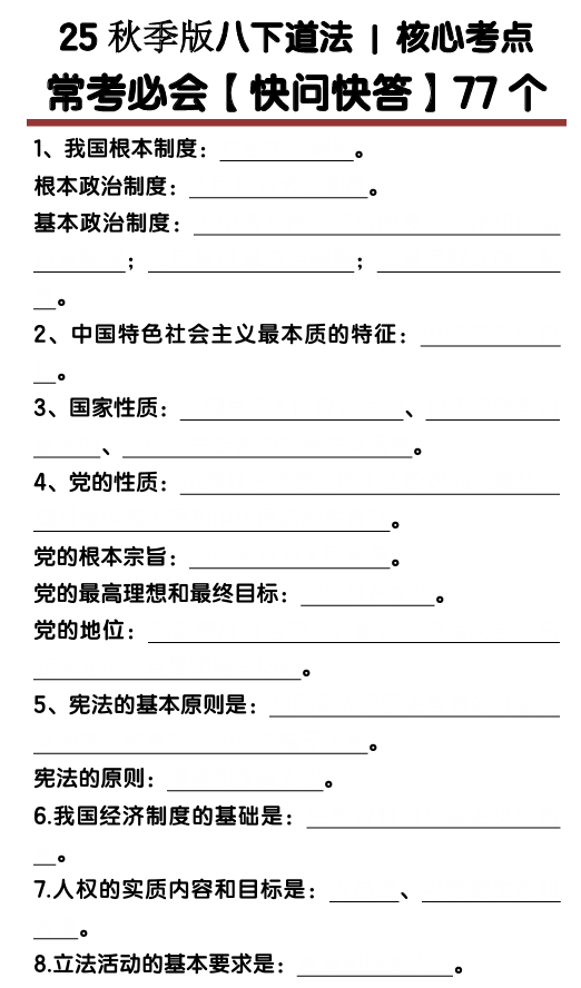 【2025秋新版】八下道法核心考点【快问快答】77个