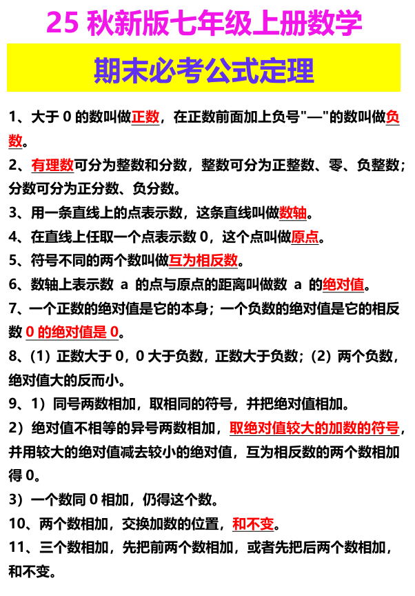 【2025秋新版】七年级上册数学 期末必考公式定理