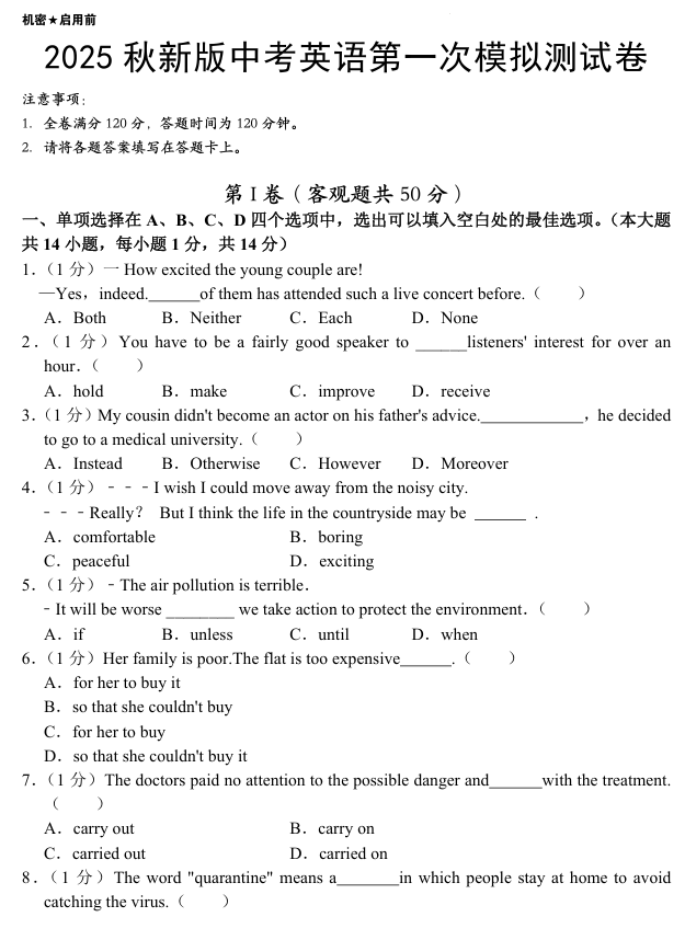 【2025秋新版】中考英语第一次模拟测试卷(含答案)