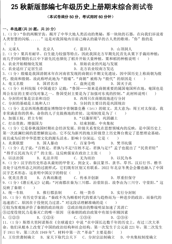 【2025秋新版】部编七年级历史上册期末综合测试卷