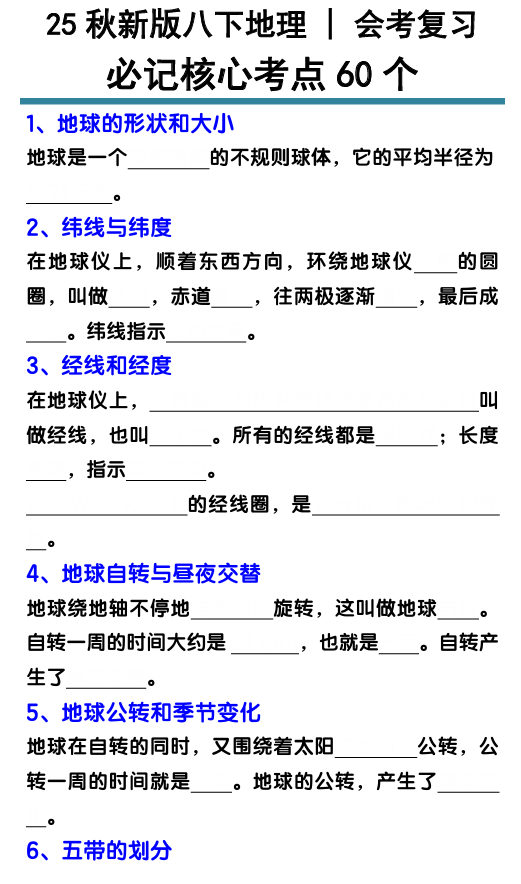 【2025秋新版】初中地理必记核心考点60个