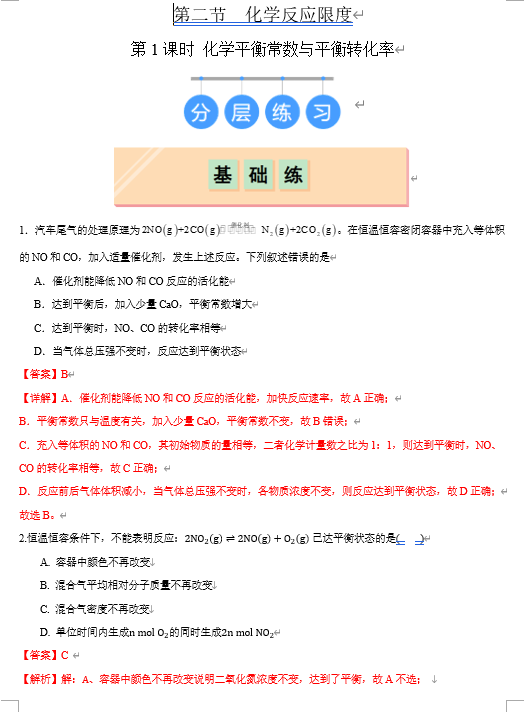 (鲁科)化学选择性必修1 随堂优练(25课时)第2节 第1课时 化学平衡常数与平衡转化率(解析版)