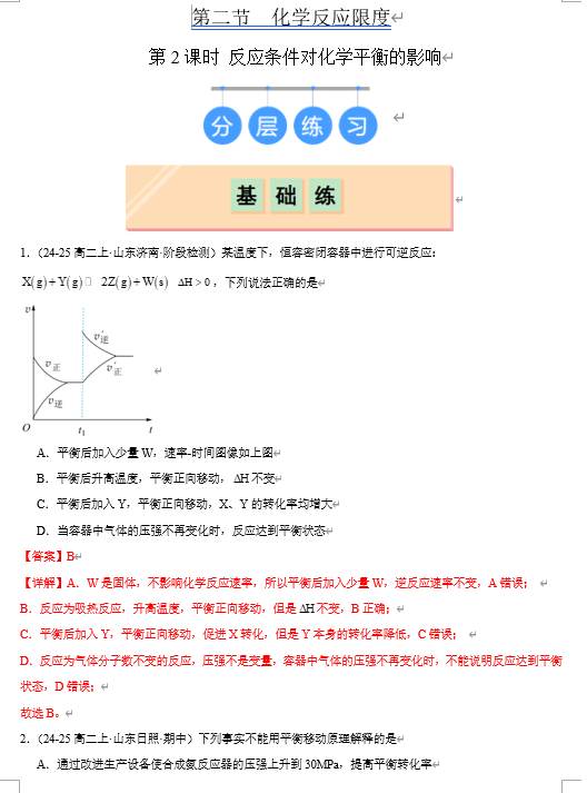(鲁科)化学选择性必修1 随堂优练(25课时)第2节 第2课时 反应条件对化学平衡的影响(解析版)