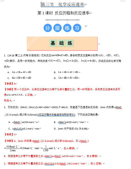 (鲁科)化学选择性必修1 随堂优练(25课时)第3节 第1课时 反应历程和反应速率(解析版)