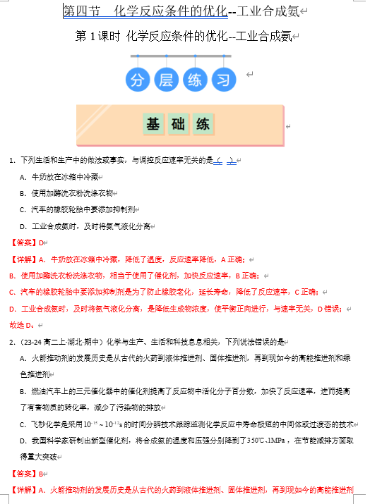 (鲁科)化学选择性必修1 随堂优练(25课时)第4节 第1课时 化学反应条件的优化--工业合成氨(解析版)