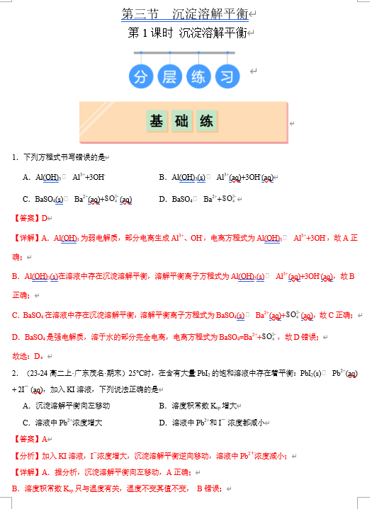 (鲁科)化学选择性必修1 随堂优练(25课时)3.3.1 沉淀溶解平衡(解析版)