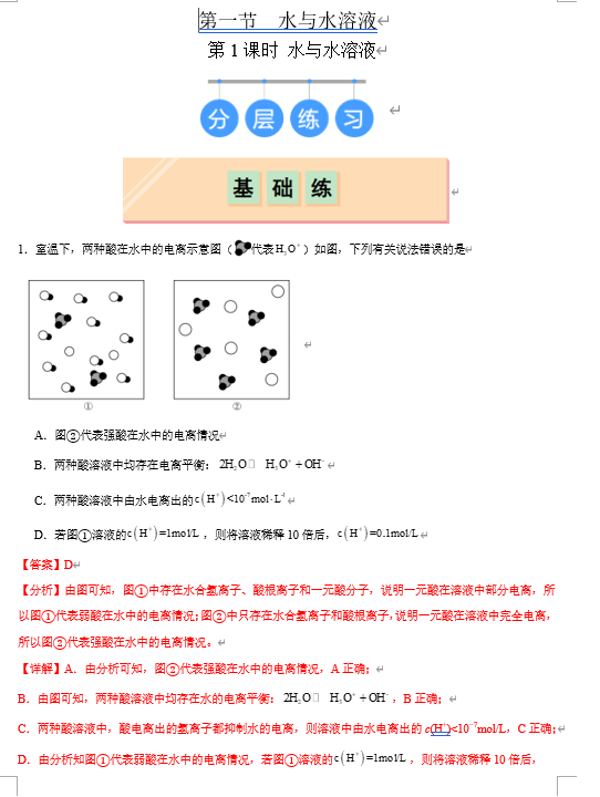 (鲁科)化学选择性必修1 随堂优练(25课时)3.1.1 水与水溶液(解析版)