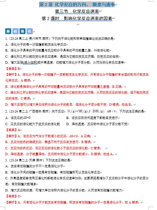 (鲁科)化学选择性必修1 随堂优练(25课时)第3节 第2课时 影响化学反应速率的因素(解析版)