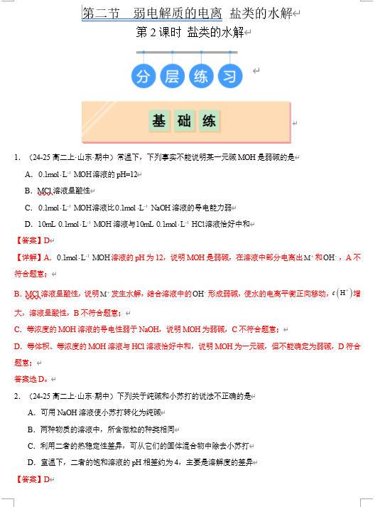 (鲁科)化学选择性必修1 随堂优练(25课时)3.2.2 盐类的水解(解析版)