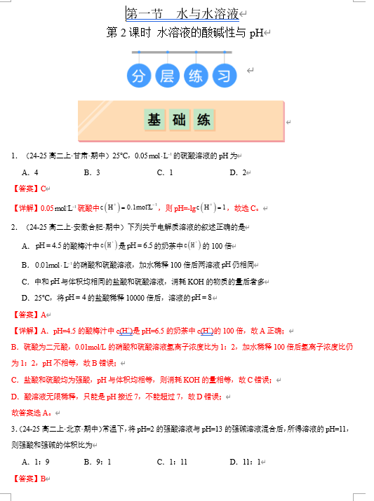 (鲁科)化学选择性必修1 随堂优练(25课时)3.1.2 水溶液的酸碱性与pH(解析版)