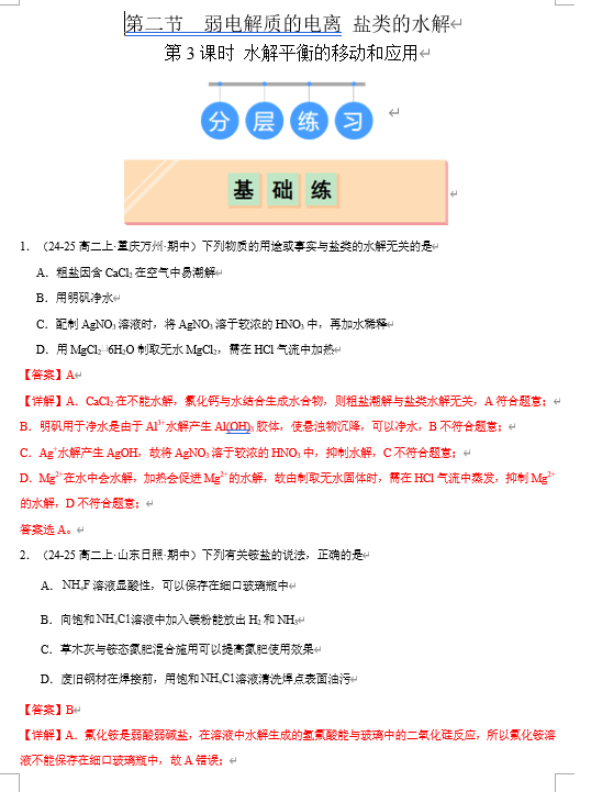 (鲁科)化学选择性必修1 随堂优练(25课时)3.2.3 水解平衡的移动和应用(解析版)
