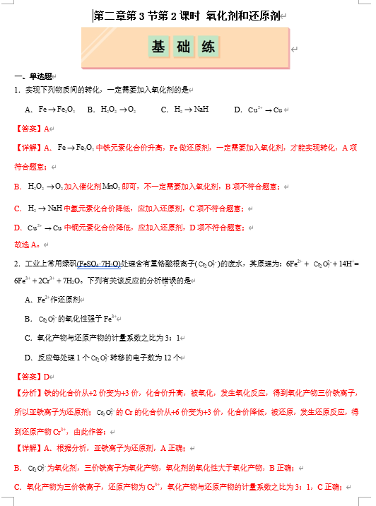 (鲁科)化学必修第一册 随堂优练+周测小卷 第二章第3节第2课时 氧化剂和还原剂(解析版)