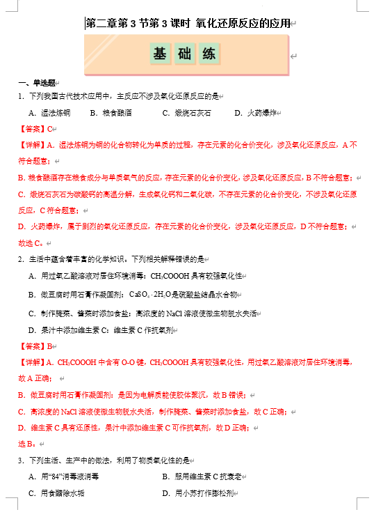 (鲁科)化学必修第一册 随堂优练+周测小卷 第二章第3节第3课时 氧化还原反应的应用(解析版)