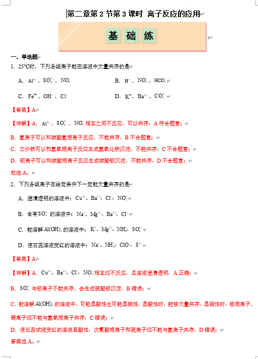 (鲁科)化学必修第一册 随堂优练+周测小卷 第二章第2节第3课时 离子反应的应用(解析版)