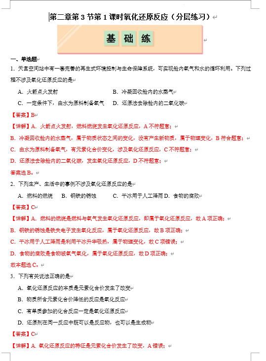 (鲁科)化学必修第一册 随堂优练+周测小卷 第二章第3节第1课时 认识氧化还原反应(解析版)