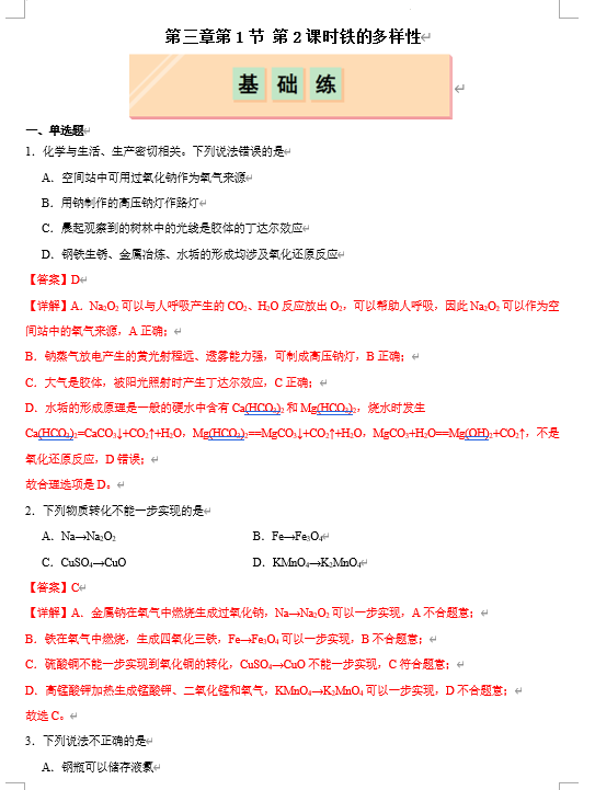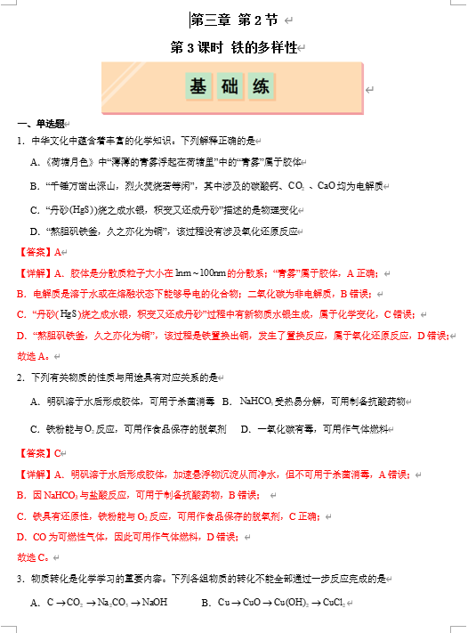 (鲁科)化学必修第一册 随堂优练+周测小卷 第三章第1节第2课时 铁、铁的氧化物和铁的氢氧化物(分层作业)(解析版)