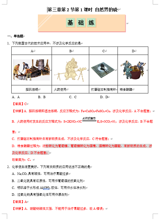 (鲁科)化学必修第一册 随堂优练+周测小卷 第三章第2节第1课时 自然界的硫(解析版)