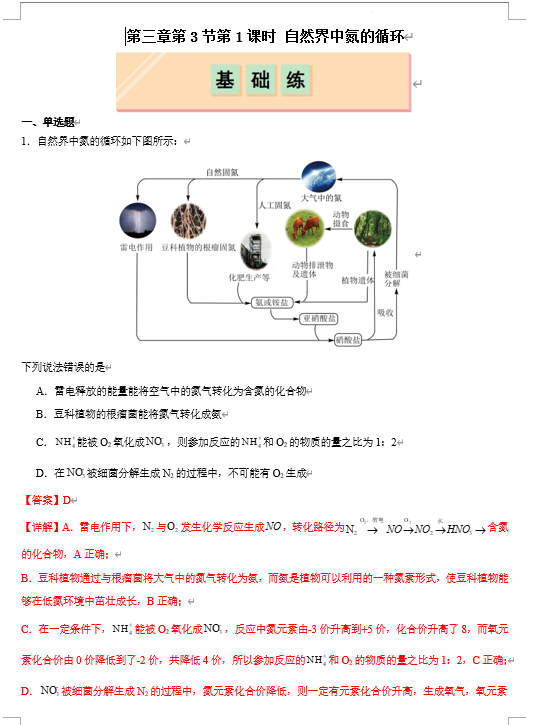 (鲁科)化学必修第一册 随堂优练+周测小卷 第三章第3节第1课时 自然界中氮的循环(解析版)