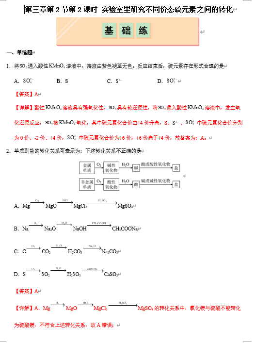 (鲁科)化学必修第一册 随堂优练+周测小卷 第三章第2节第2课时 实验室里研究不同价态硫元素之间的转化(解析版)