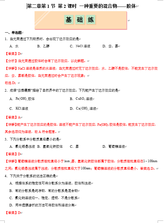 (鲁科)化学必修第一册 随堂优练+周测小卷 第二章第1节 第2课时 一种重要的混合物——胶体(解析版)