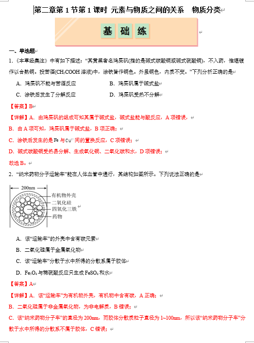 (鲁科)化学必修第一册 随堂优练+周测小卷 第二章第1节 第1课时 元素与物质之间的关系 物质分类(解析版)