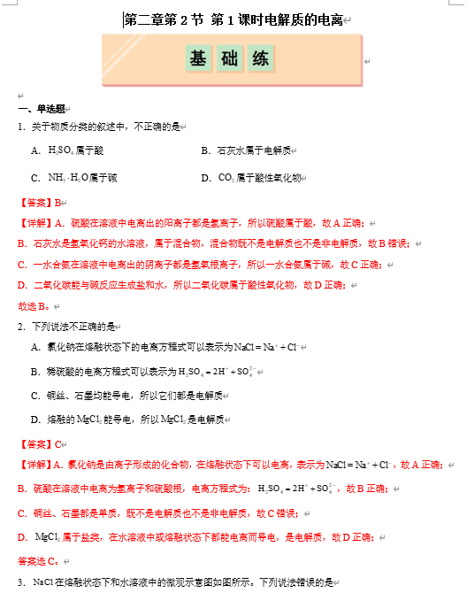 (鲁科)化学必修第一册 随堂优练+周测小卷 第二章第2节第1课时 电解质的电离(解析版)