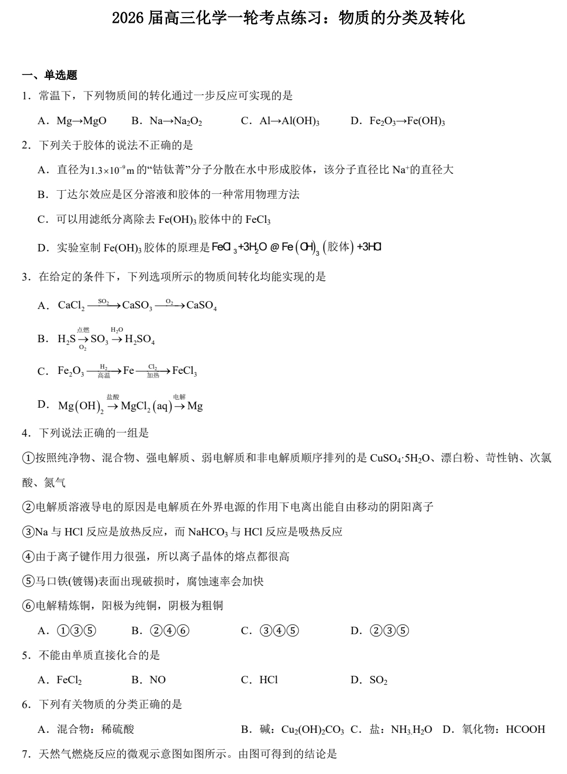 2026届高三化学一轮考点练习:物质的分类及转化
