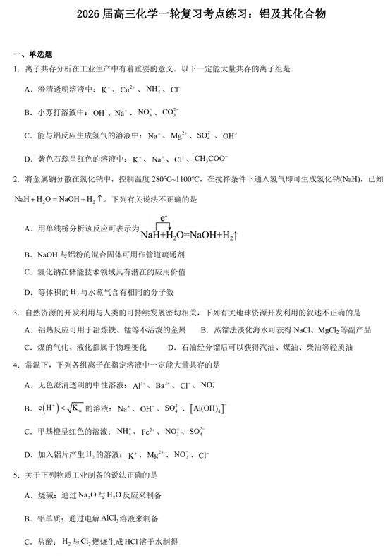 2026届高三化学一轮复习考点练习:铝及其化合物