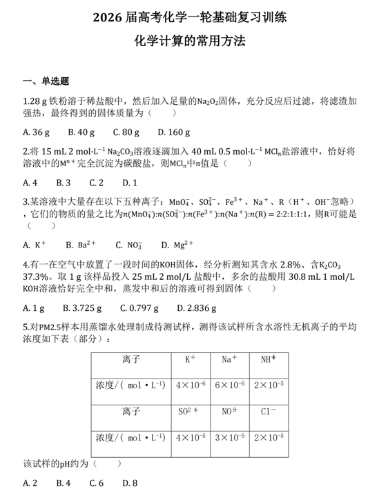 2026届高三化学一轮复习++基础复习训练7+化学计算的常用方法