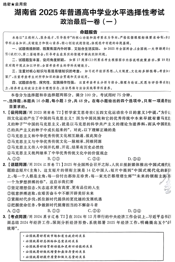 (湖南专版)2025年《金考卷·百校联盟·最后一卷》政治A4
