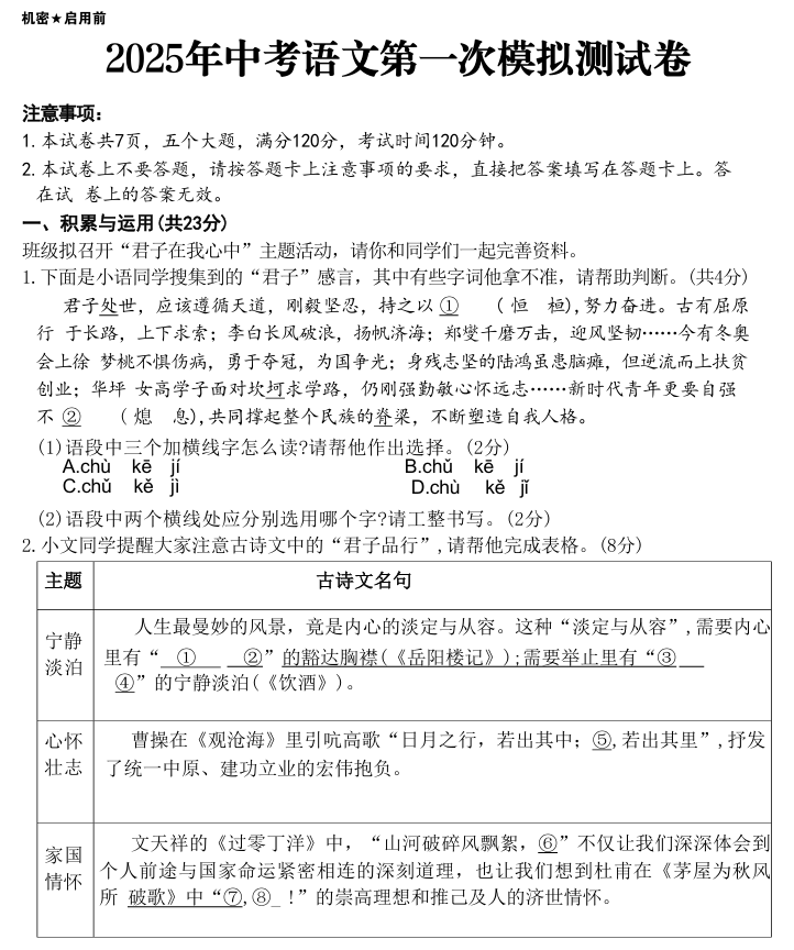 2025年春中考语文第一次模拟测试卷