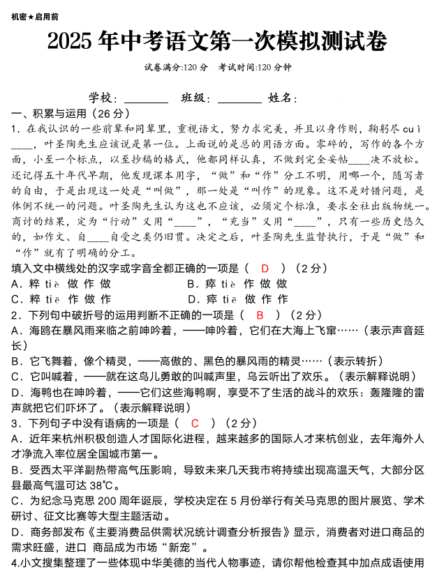 2025年中考语文第一次模拟测试卷及答案