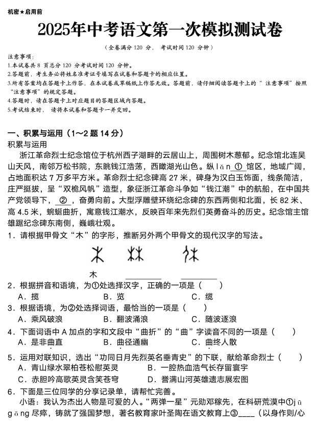 2025年中考语文第一次模拟测试卷