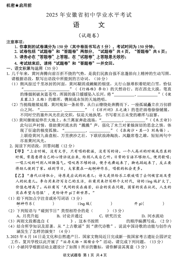 2025年安徽省大联考九年级初中学业水平模拟考试语文卷