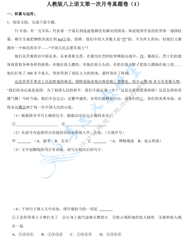 2025人教版八上语文第一次月考真题卷 电子版下载