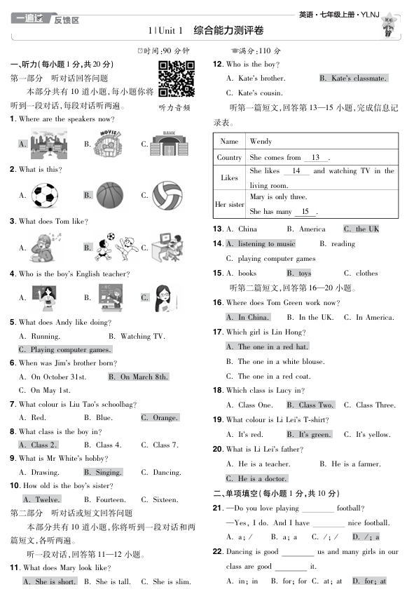2024秋一遍过七上英语译林牛津版教用 单元卷