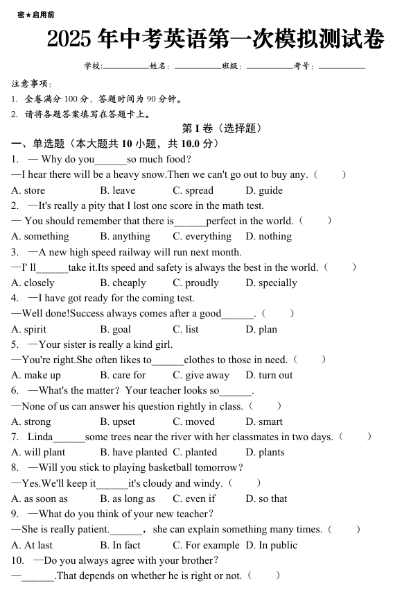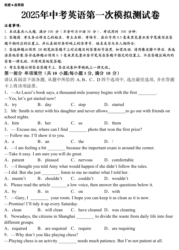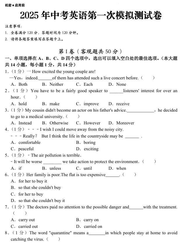 2025年中考英语第一次模拟测试卷